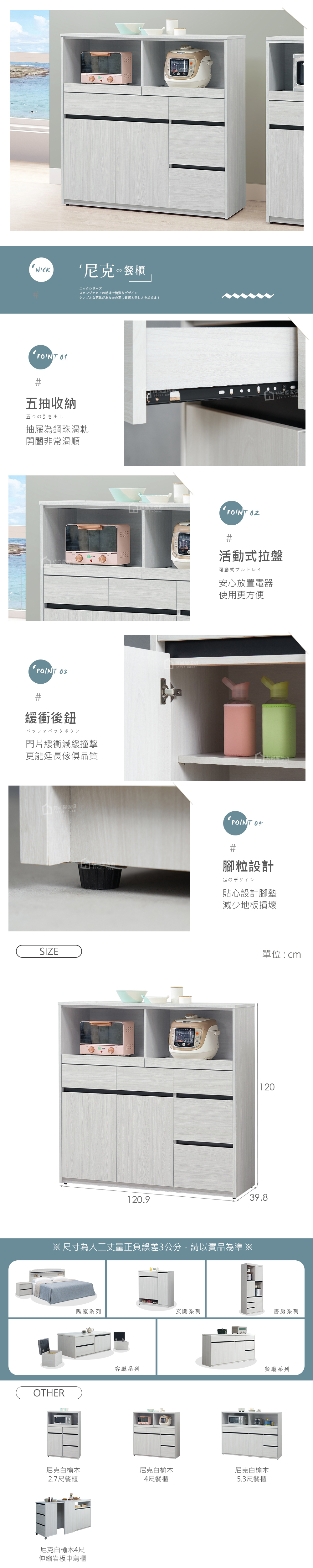 【時尚屋】[DV11]尼克白榆木4尺餐櫃,色系白榆木色為主,點綴廚房視覺空間美感,材質上採用木心板、鋼珠滑軌、緩衝後鈕等,均高於市場之產品規格,品質絕對有保證!此餐櫃在收納空間上採五抽,絕對可滿足您對收納的需求,相當於收納櫃之功能!有了他絕對可以讓您煥然一新!時尚屋帶給您對家具時尚新品味。