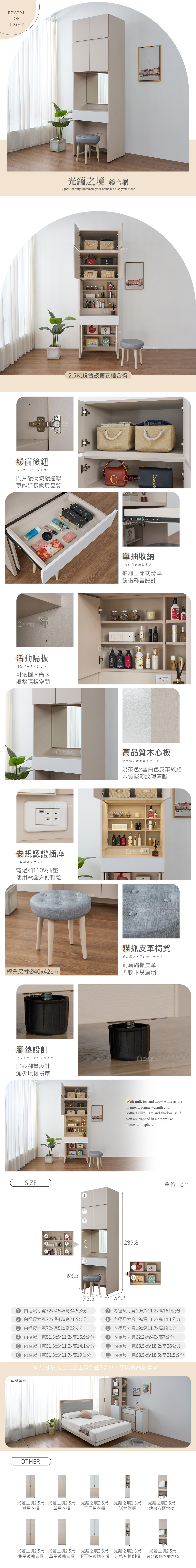 名稱:光蘊之境2.5尺LED燈鏡台被櫥衣櫃含椅
