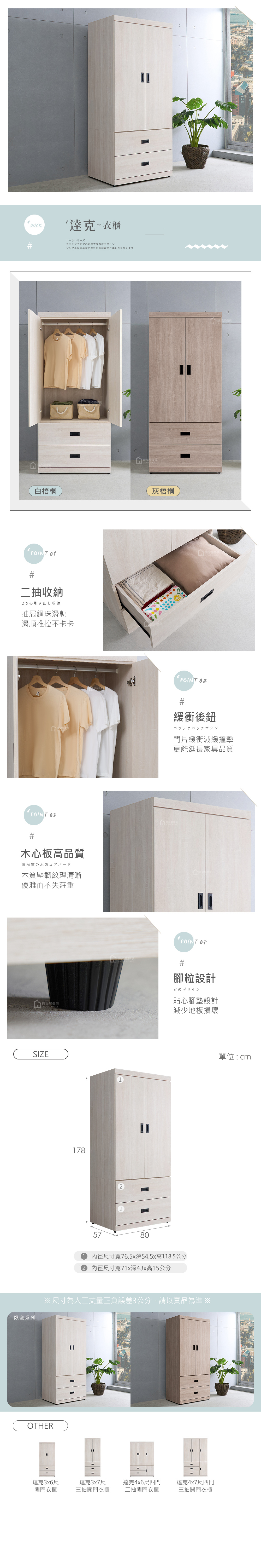 【時尚屋】[UF13]達克3x6尺開門衣櫃,色系白梧桐、灰梧桐為主,點綴臥室視覺空間美感,材質上採用木心板、鋼珠滑軌、緩衝後鈕等,均高於市場之產品規格,品質絕對有保證!此衣櫃在收納空間上採二抽,絕對可滿足您對收納的需求,相當於收納櫃之功能!有了他絕對可以讓您煥然一新!時尚屋帶給您對家具時尚新品味。