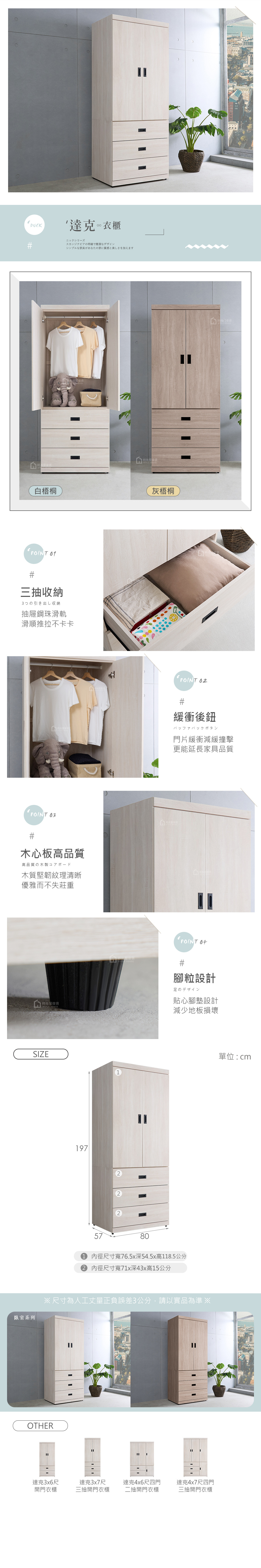【時尚屋】[UF13]達克3x7尺三抽開門衣櫃,色系白梧桐、灰梧桐為主,點綴臥室視覺空間美感,材質上採用木心板、鋼珠滑軌、緩衝後鈕等,均高於市場之產品規格,品質絕對有保證!此衣櫃在收納空間上採三抽,絕對可滿足您對收納的需求,相當於收納櫃之功能!有了他絕對可以讓您煥然一新!時尚屋帶給您對家具時尚新品味。