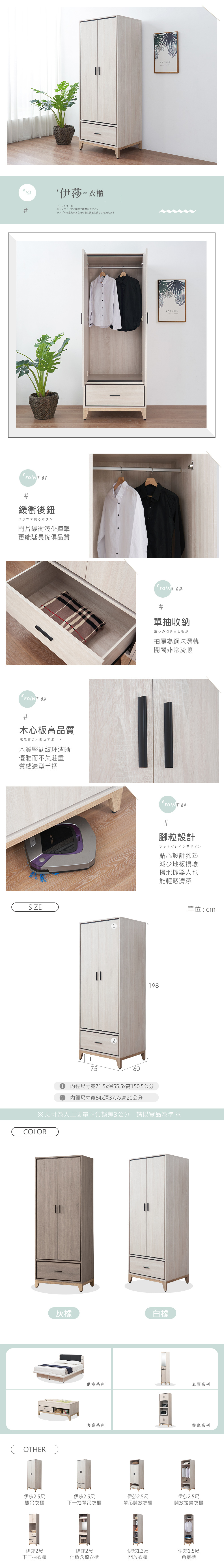 【時尚屋】[RV9]伊莎2.5尺下一抽單吊衣櫃,色系白橡、灰橡色為主,點綴臥室視覺空間美感,材質上採用木心板、緩衝後鈕、鋼珠滑軌等,均高於市場之產品規格,品質絕對有保證!此衣櫃在收納空間上採雙開門,絕對可滿足您對收納的需求,相當於收納櫃之功能!有了他絕對可以讓您煥然一新!時尚屋帶給您對家具時尚新品味。