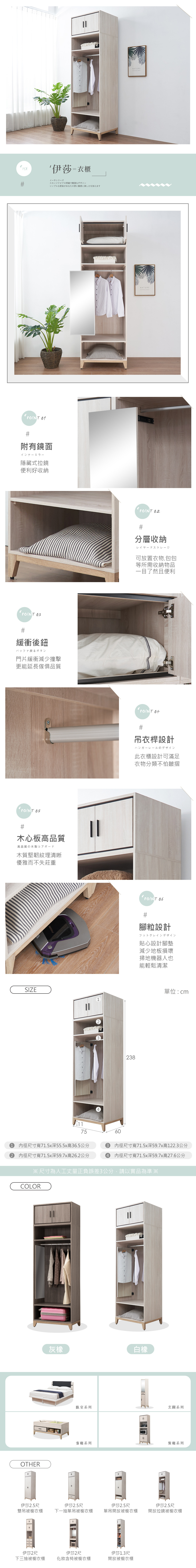 【時尚屋】[RV9]伊莎2.5尺開放拉鏡被櫥衣櫃,色系白橡、灰橡色為主,點綴臥室視覺空間美感,材質上採用木心板等,均高於市場之產品規格,品質絕對有保證!此衣櫃在收納空間上採開放式+雙開門,絕對可滿足您對收納的需求,相當於收納櫃之功能!有了他絕對可以讓您煥然一新!時尚屋帶給您對家具時尚新品味。