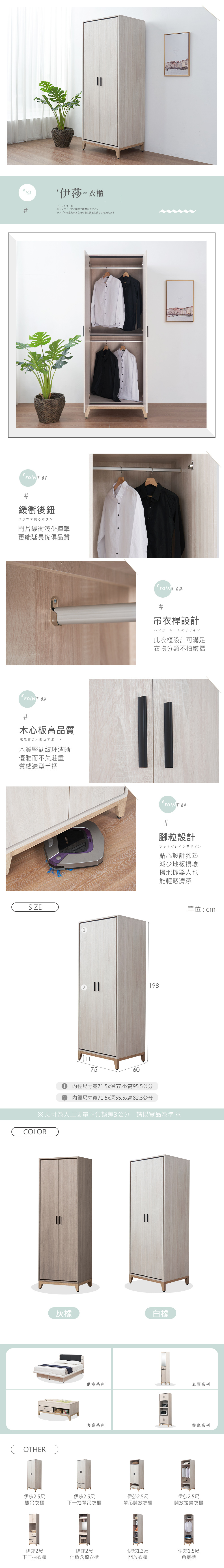 【時尚屋】[RV9]伊莎2.5尺雙吊衣櫃,色系白橡、灰橡色為主,點綴臥室視覺空間美感,材質上採用木心板、緩衝後鈕等,均高於市場之產品規格,品質絕對有保證!此衣櫃在收納空間上採雙開門,絕對可滿足您對收納的需求,相當於收納櫃之功能!有了他絕對可以讓您煥然一新!時尚屋帶給您對家具時尚新品味。