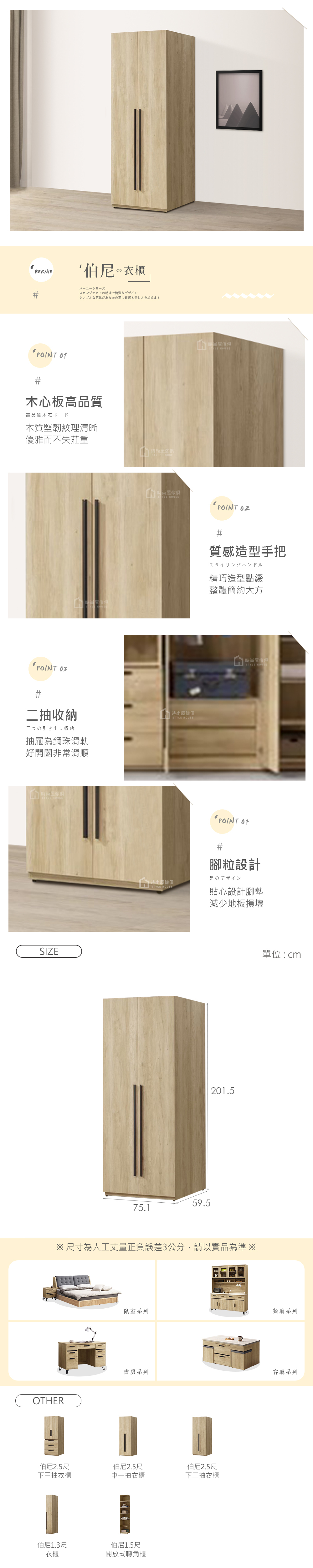 名稱:伯尼2.5尺下二抽衣櫃