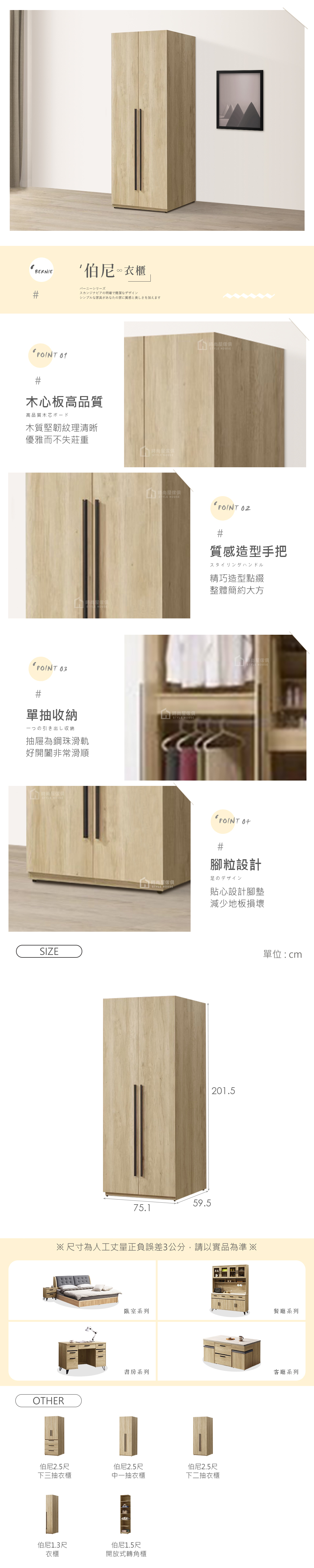【時尚屋】[DU10]伯尼2.5尺中一抽衣櫃,色系橡木色為主,點綴臥室視覺空間美感,材質上採用木心板、鋼珠滑軌、緩衝後鈕等,均高於市場之產品規格,品質絕對有保證!此衣櫃在收納空間上採單抽,絕對可滿足您對收納的需求,相當於收納櫃之功能!有了他絕對可以讓您煥然一新!時尚屋帶給您對家具時尚新品味。
