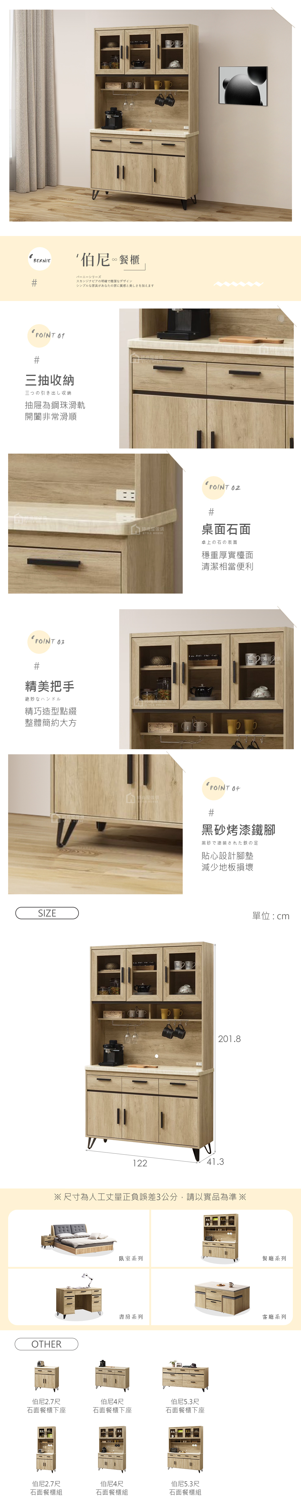 【時尚屋】[DU10]伯尼4尺石面餐櫃組,色系橡木色為主,點綴廚房視覺空間美感,材質上採用木心板、鋼珠滑軌、石面、緩衝後鈕等,均高於市場之產品規格,品質絕對有保證!此餐櫃在收納空間上採三抽+單雙開門,絕對可滿足您對收納的需求,相當於收納櫃之功能!有了他絕對可以讓您煥然一新!時尚屋帶給您對家具時尚新品味。
