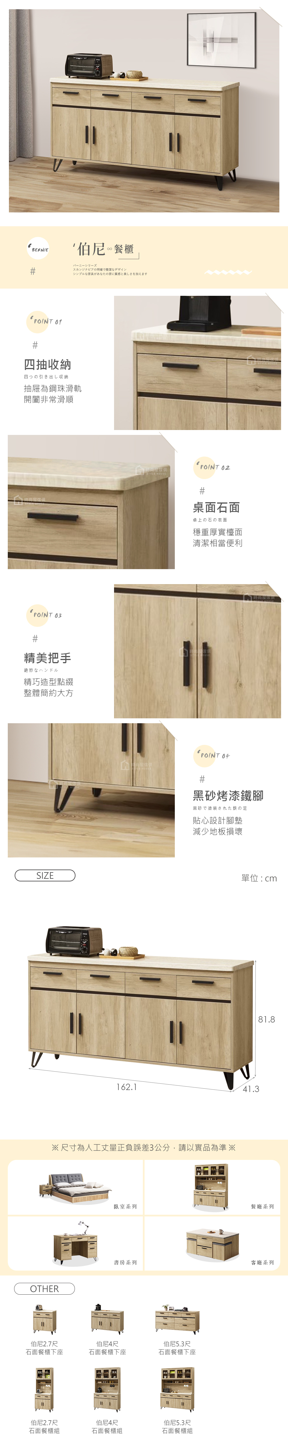 【時尚屋】[DU10]伯尼5.3尺石面餐櫃下座,色系橡木色為主,點綴廚房視覺空間美感,材質上採用木心板、鋼珠滑軌、石面、緩衝後鈕等,均高於市場之產品規格,品質絕對有保證!此餐櫃在收納空間上採四抽+雙開門,絕對可滿足您對收納的需求,相當於收納櫃之功能!有了他絕對可以讓您煥然一新!時尚屋帶給您對家具時尚新品味。