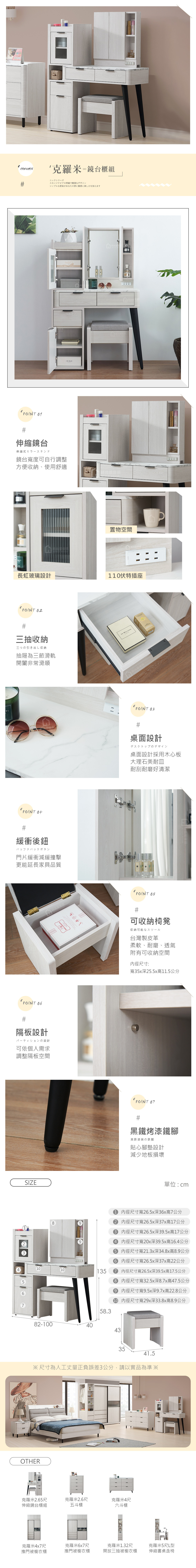 名稱:克羅米2.65尺伸縮鏡台櫃組含椅