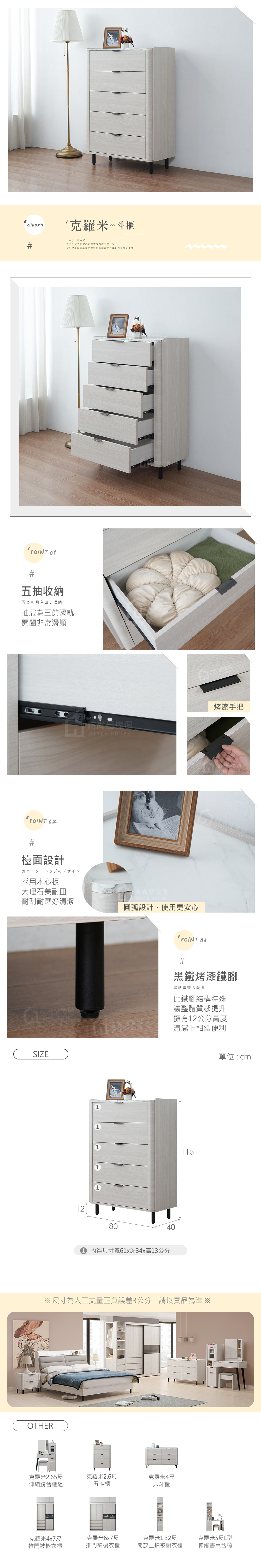 【時尚屋】[5U11]克羅米2.6尺五斗櫃,色系白橡色為主,點綴臥室視覺空間美感,材質上採用木心板、三節滑軌、鐵腳等,均高於市場之產品規格,品質絕對有保證!此斗櫃在收納空間上採五抽,絕對可滿足您對收納的需求,相當於收納櫃之功能!有了他絕對可以讓您煥然一新!時尚屋帶給您對家具時尚新品味。