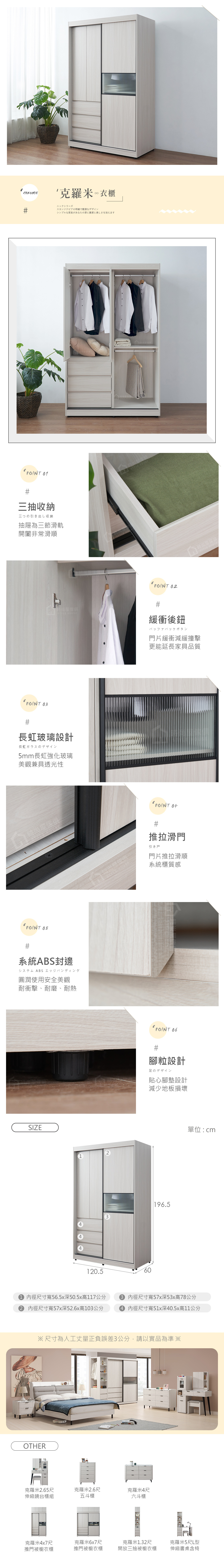 【時尚屋】[5U11]克羅米4x7尺推門衣櫃,色系白橡色為主,點綴臥室視覺空間美感,材質上採用木心板、緩衝後鈕、ABS封邊、長虹玻璃、三節滑軌等,均高於市場之產品規格,品質絕對有保證!此衣櫃在收納空間上採三抽+雙開門+滑門,絕對可滿足您對收納的需求,相當於收納櫃之功能!有了他絕對可以讓您煥然一新!時尚屋帶給您對家具時尚新品味。