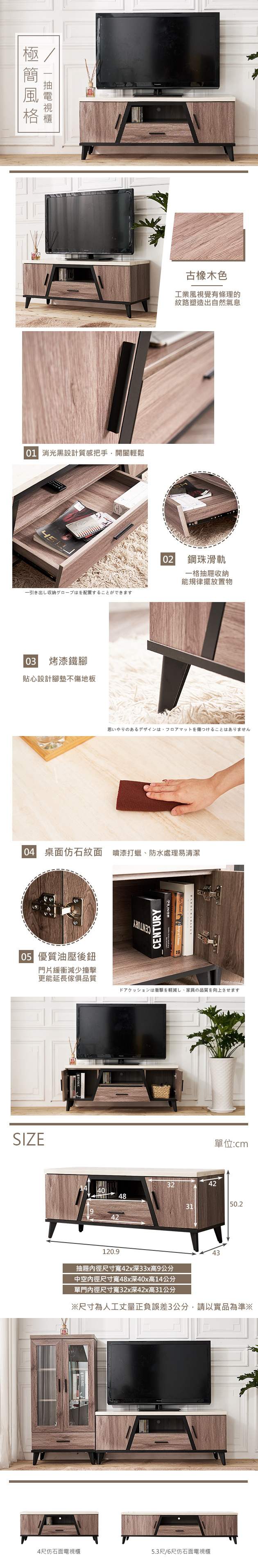【時尚屋】[DV10]克里斯4尺仿石面電視櫃,色系古橡木色為主,點綴客廳視覺空間美感,材質上採用木心板、仿石紋面、油壓後鈕、鋼珠滑軌、烤漆鐵腳等,均高於市場之產品規格,品質絕對有保證!此電視櫃在收納空間上採一抽+單開門,絕對可滿足您對收納的需求,相當於收納櫃之功能!有了他絕對可以讓您煥然一新!時尚屋帶給您對家具時尚新品味。