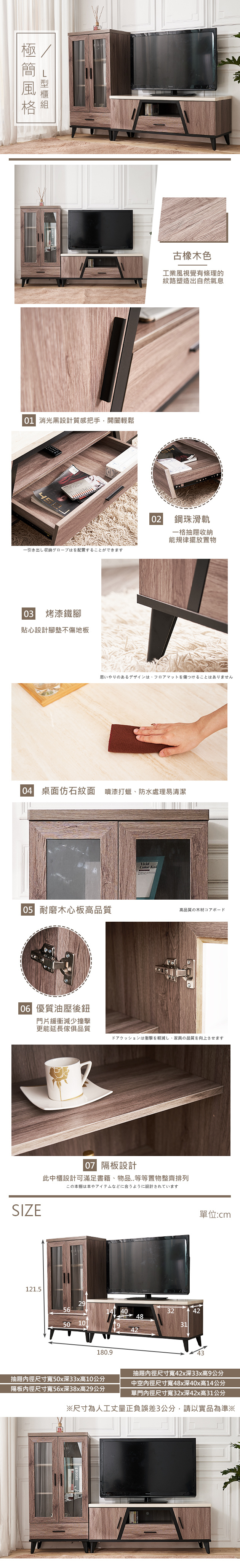 【時尚屋】[DV10]克里斯6尺L型櫃組,色系古橡木色為主,點綴客廳視覺空間美感,材質上採用木心板、仿石紋面、油壓後鈕、鋼珠滑軌、烤漆鐵腳等,均高於市場之產品規格,品質絕對有保證!此L型櫃在收納空間上採二抽+單開門+雙開門,絕對可滿足您對收納的需求,相當於收納櫃之功能!有了他絕對可以讓您煥然一新!時尚屋帶給您對家具時尚新品味。