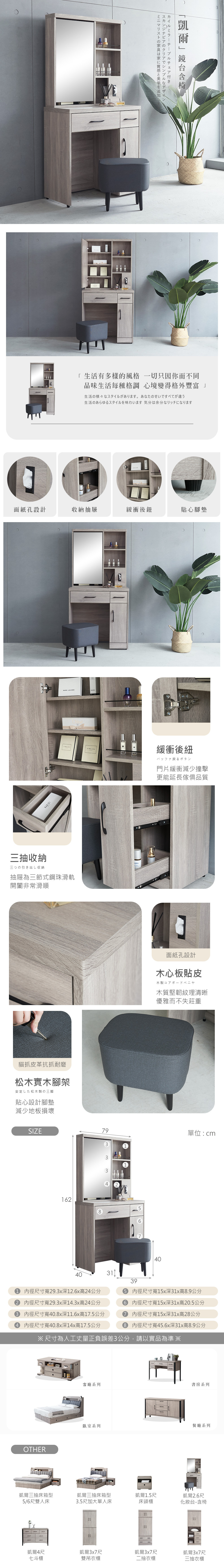 【時尚屋】[5V23]凱爾2.6尺化妝台-含椅,色系灰橡色為主,點綴臥室視覺空間美感,材質上採木心板貼皮、三節式鋼珠滑軌、緩衝後鈕、松木實木腳等,均高於市場之產品規格,品質絕對有保證!此化妝台在收納空間上採三抽+單開門,絕對可滿足您對收納的需求,設計質感及耐用性絕對是首選。有了他絕對可以讓您煥然一新!時尚屋帶給您對家具時尚新品味。