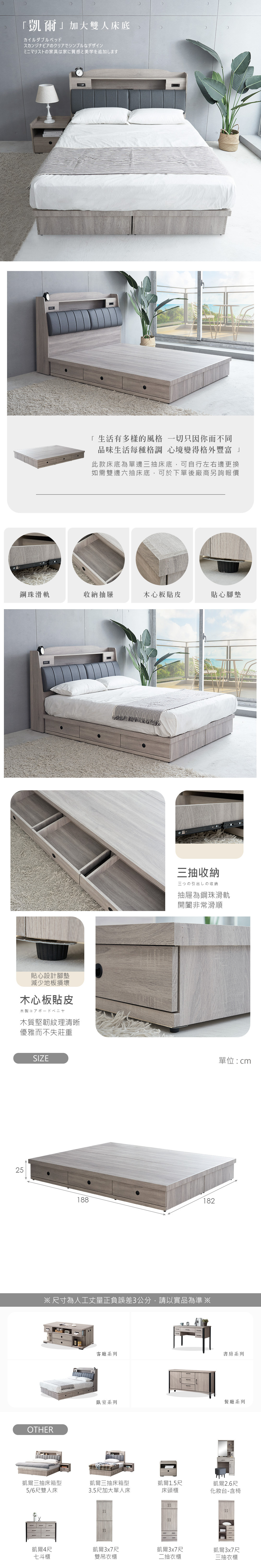 名稱:凱爾6尺三抽加大雙人床底