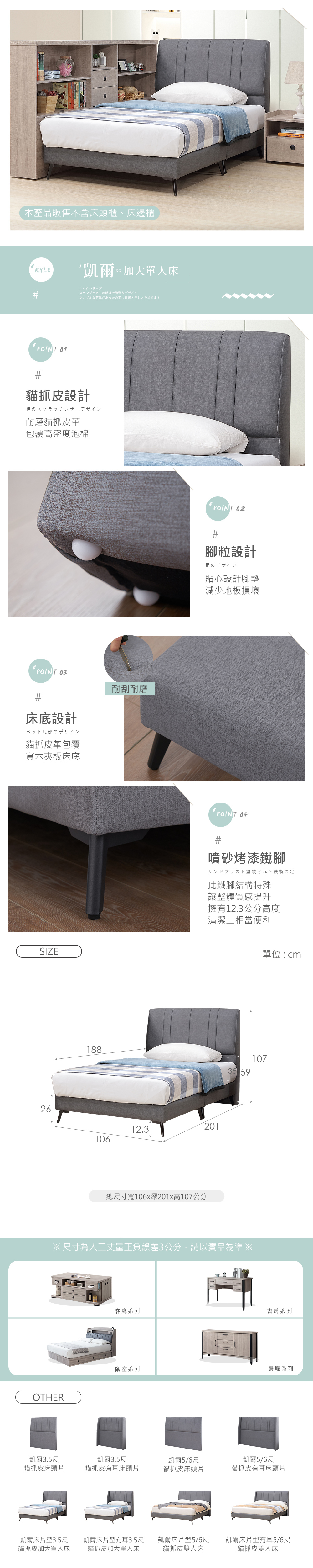 名稱:凱爾床片型3.5尺貓抓皮加大單人床