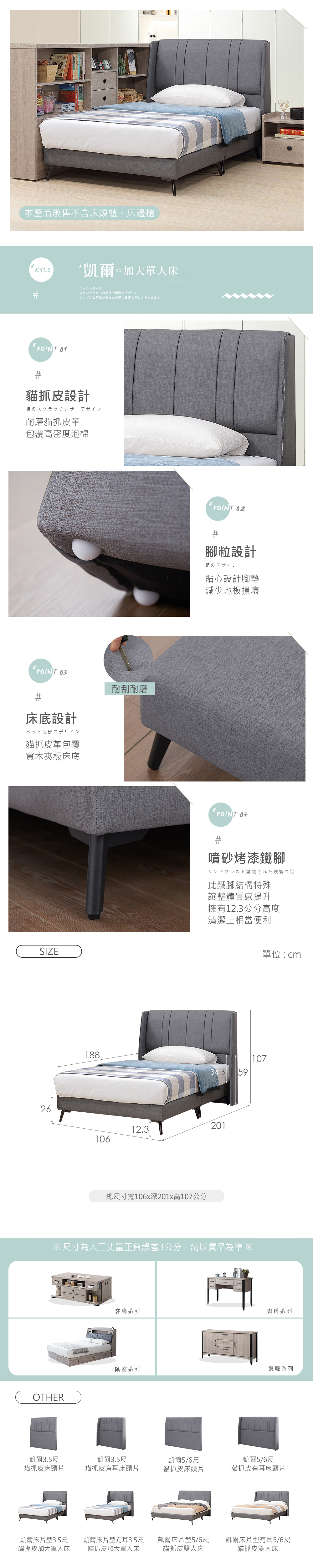 【時尚屋】[5V25]凱爾床片型有耳3.5尺貓抓皮加大單人床,色系灰色為主,點綴臥室視覺空間美感,材質上採用貓抓皮革、高密度泡棉、框架實木夾板、噴砂烤漆鐵腳等,均高於市場之產品規格,品質絕對有保證!此單人床舒適程度絕對可滿足您的需求!設計質感及耐用性絕對是首選。有了他絕對可以讓您煥然一新!時尚屋帶給您對家具時尚新品味。