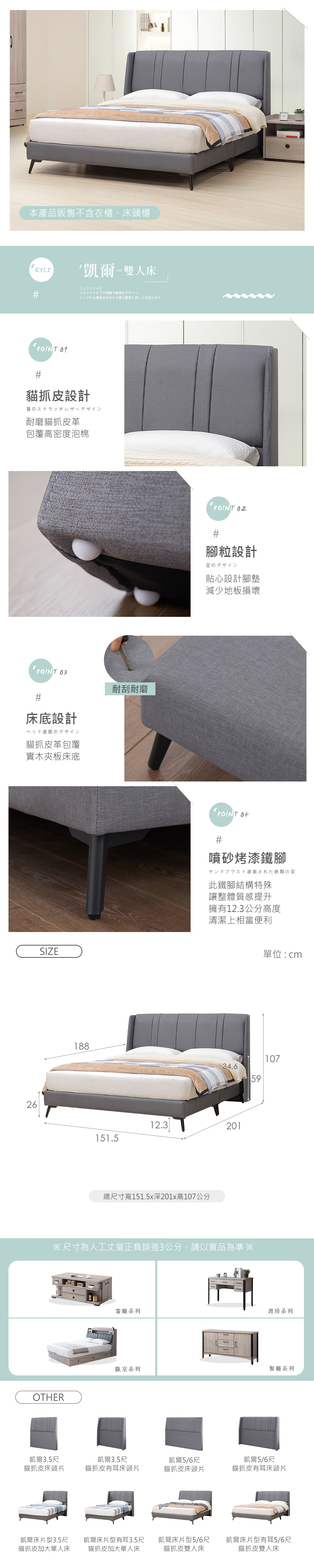 名稱:凱爾床片型有耳5尺貓抓皮雙人床