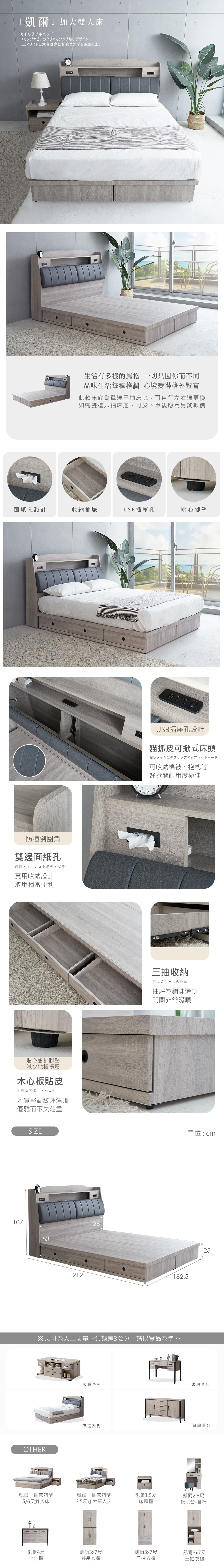 【時尚屋】[5V21]凱爾貓抓皮三抽床箱型6尺加大雙人床,色系灰橡色為主,點綴臥室視覺空間美感,材質上採木心板貼皮、鋼珠滑軌、貓抓皮靠枕等,均高於市場之產品規格,品質絕對有保證!此床組在收納空間上採三抽,絕對可滿足您對收納的需求,設計質感及耐用性絕對是首選。有了他絕對可以讓您煥然一新!時尚屋帶給您對家具時尚新品味。