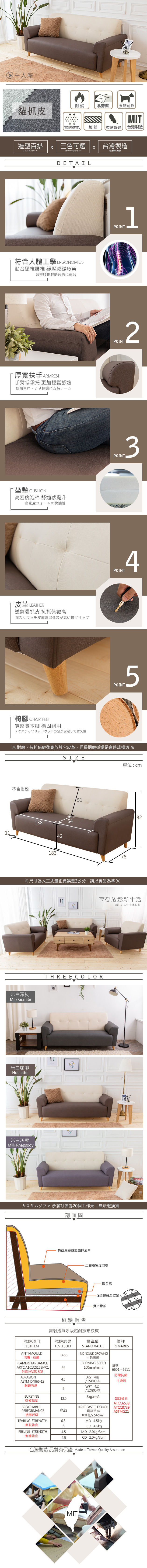 | 名稱:布萊茲三人座雙色透氣貓抓皮沙發 型號:FZ11-105-3 內容:透氣皮革、高密度泡棉、聚合棉、S型彈簧.皮帶、實木骨架 尺寸:寬183x深78x高82公分 【時尚屋】[FZ11]布萊茲三人座雙色透氣貓抓皮沙發,色系以米白咖啡色為主,點綴客廳視覺空間美感,材質上採用透氣皮革、高密度泡棉、聚合棉、S型彈簧.皮帶、實木骨架等,均高於市場之產品規格,品質絕對有保證!乘坐舒適度達到最高效果!設計質感及耐用性絕對是首選。有了他絕對可以讓您煥然一新!時尚屋帶給您對家具時尚新品味。 ◆採用符合標準材質讓你用的安心。 ◆此商品不需要DIY組立,此商品為組立後之成品。 ◆品質保證、專業設計、貼心服務。 ◆全由專人配送到家,專業安心服務,替你省下更多時間。 |