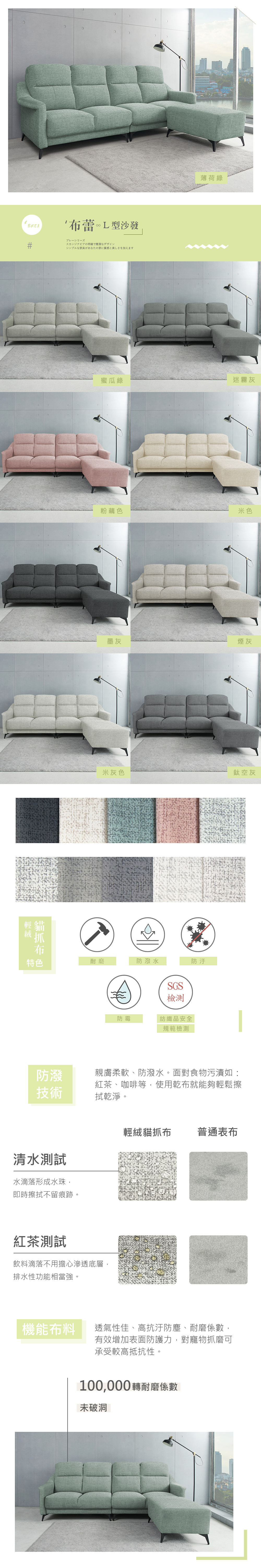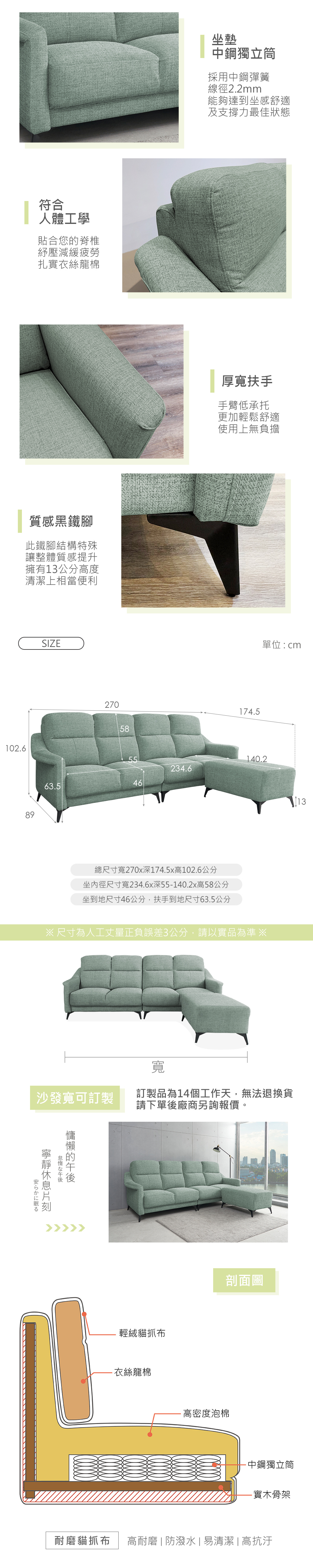 | 名稱:台灣製布蕾大L型中鋼彈簧輕絨貓抓布沙發 型號:FZ11-140-4+5 內容:輕絨貓抓布、衣絲龍棉、高密度泡棉、中鋼彈簧、實木骨架、黑鐵腳 尺寸:寬270x深174.5x高102.6公分 【時尚屋】[FZ11]台灣製布蕾大L型中鋼彈簧輕絨貓抓布沙發,色系以薄荷綠色為主,點綴客廳視覺空間美感,材質上採用北歐輕絨貓抓布、衣絲龍棉、高密度泡棉、中鋼彈簧、實木骨架、黑鐵腳等,均高於市場之產品規格,品質絕對有保證!乘坐舒適度達到最高效果!設計質感及耐用性絕對是首選。有了他絕對可以讓您煥然一新!時尚屋帶給您對家具時尚新品味。 ◆採用符合標準材質讓你用的安心。 ◆此商品不需要DIY組立,此商品為組立後之成品。 ◆品質保證、專業設計、貼心服務。 ◆全由專人配送到家,專業安心服務,替你省下更多時間。 |