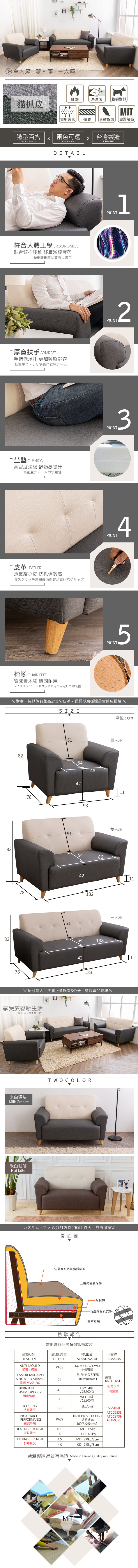 | 名稱:畢維斯1+2+3人座雙色透氣貓抓皮沙發 型號:FZ11-105 內容:透氣皮革、高密度泡棉、聚合棉、S型彈簧.皮帶、實木骨架 尺寸:單人座-寬93x深78x高82公分、雙人座-寬132x深78x高82公分、三人座-寬183x深78x高82公分 【時尚屋】[FZ11]畢維斯1+2+3人座雙色透氣貓抓皮沙發,色系以米白深灰色為主,點綴客廳視覺空間美感,材質上採用透氣皮革、高密度泡棉、聚合棉、S型彈簧.皮帶、實木骨架等,均高於市場之產品規格,品質絕對有保證!乘坐舒適度達到最高效果!設計質感及耐用性絕對是首選。有了他絕對可以讓您煥然一新!時尚屋帶給您對家具時尚新品味。 ◆採用符合標準材質讓你用的安心。 ◆此商品不需要DIY組立,此商品為組立後之成品。 ◆品質保證、專業設計、貼心服務。 ◆全由專人配送到家,專業安心服務,替你省下更多時間。 |