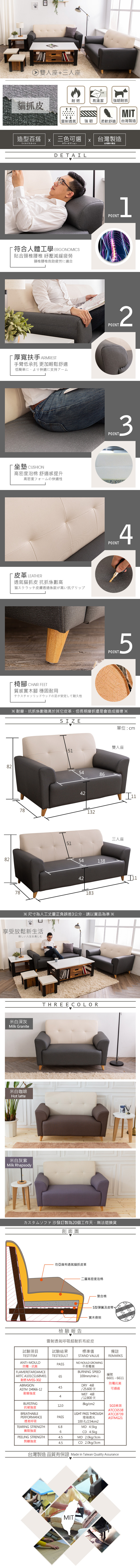 | 名稱:畢維斯2+3人座雙色透氣貓抓皮沙發 型號:FZ11-105-2+3 內容:透氣皮革、高密度泡棉、聚合棉、S型彈簧.皮帶、實木骨架 尺寸:雙人座-寬132x深78x高82公分、三人座-寬183x深78x高82公分 【時尚屋】[FZ11]畢維斯2+3人座雙色透氣貓抓皮沙發,色系以米白深灰色為主,點綴客廳視覺空間美感,材質上採用透氣皮革、高密度泡棉、聚合棉、S型彈簧.皮帶、實木骨架等,均高於市場之產品規格,品質絕對有保證!乘坐舒適度達到最高效果!設計質感及耐用性絕對是首選。有了他絕對可以讓您煥然一新!時尚屋帶給您對家具時尚新品味。 ◆採用符合標準材質讓你用的安心。 ◆此商品不需要DIY組立,此商品為組立後之成品。 ◆品質保證、專業設計、貼心服務。 ◆全由專人配送到家,專業安心服務,替你省下更多時間。 |