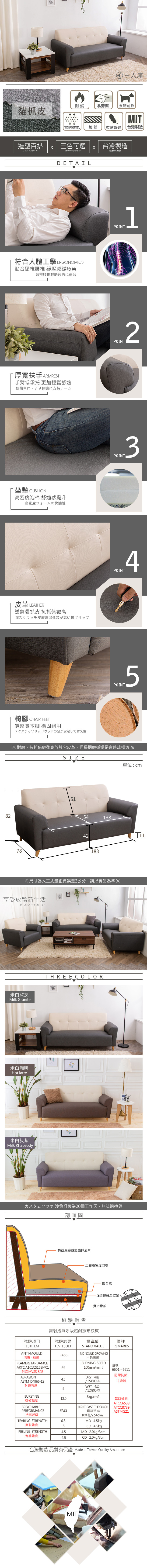| 名稱:畢維斯三人座雙色透氣貓抓皮沙發 型號:FZ11-105-3 內容:透氣皮革、高密度泡棉、聚合棉、S型彈簧.皮帶、實木骨架 尺寸:寬183x深78x高82公分 【時尚屋】[FZ11]畢維斯三人座雙色透氣貓抓皮沙發,色系以米白深灰色為主,點綴客廳視覺空間美感,材質上採用透氣皮革、高密度泡棉、聚合棉、S型彈簧.皮帶、實木骨架等,均高於市場之產品規格,品質絕對有保證!乘坐舒適度達到最高效果!設計質感及耐用性絕對是首選。有了他絕對可以讓您煥然一新!時尚屋帶給您對家具時尚新品味。 ◆採用符合標準材質讓你用的安心。 ◆此商品不需要DIY組立,此商品為組立後之成品。 ◆品質保證、專業設計、貼心服務。 ◆全由專人配送到家,專業安心服務,替你省下更多時間。 |