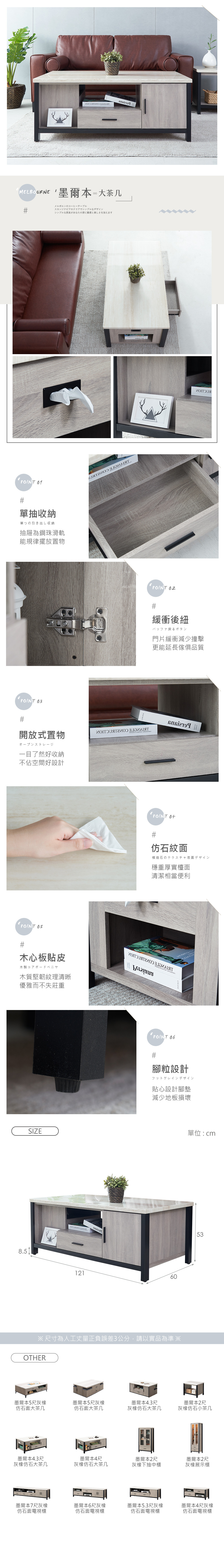 【時尚屋】[DV10]墨爾本4尺灰橡仿石面大茶几,色系灰橡色為主,點綴客廳視覺空間美感,材質上採木心板貼皮、仿石紋面、緩衝後鈕、鋼珠滑軌等,均高於市場之產品規格,品質絕對有保證!此茶几在收納空間上採單抽+單開門,絕對可滿足您對收納的需求,設計質感及耐用性絕對是首選。有了他絕對可以讓您煥然一新!時尚屋帶給您對家具時尚新品味。