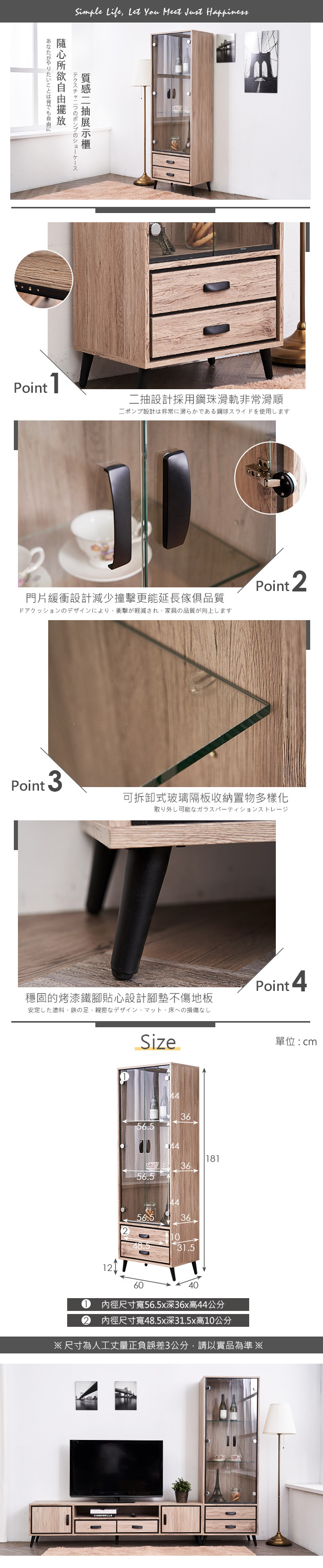 【時尚屋】[RV8]奧爾頓橡木2尺展示櫃,色系橡木色為主,點綴客廳視覺空間美感,材質上採用木心板、鋼珠滑軌、緩衝後鈕、玻璃隔板、鐵腳等,均高於市場之產品規格,品質絕對有保證!此展示櫃在收納空間上採雙開門+二抽,絕對可滿足您對收納的需求,相當於收納櫃之功能!有了他絕對可以讓您煥然一新!時尚屋帶給您對家具時尚新品味。