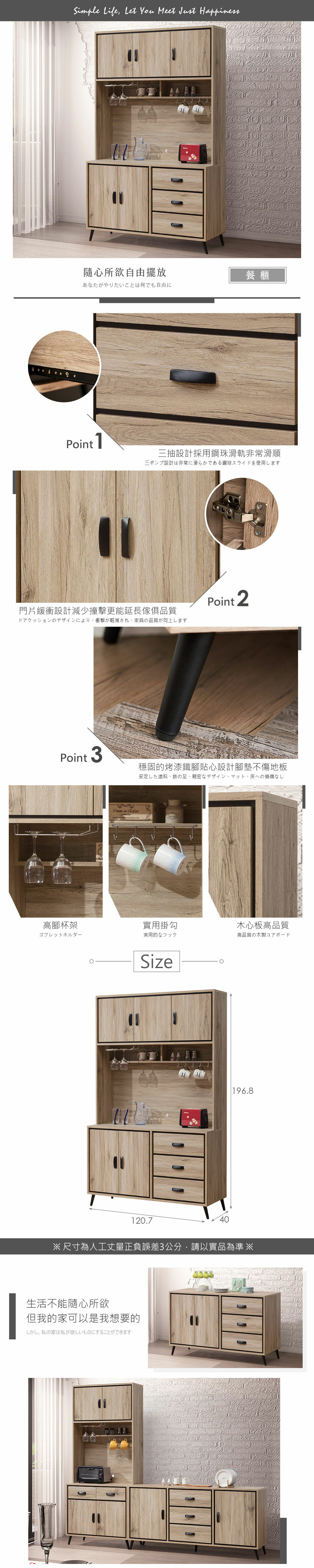 【時尚屋】[RV8]奧爾頓橡木4尺碗盤櫃組,色系橡木色為主,點綴餐廳視覺空間美感,材質上採用木心板、鋼珠滑軌、緩衝後鈕、烤漆鐵腳等,均高於市場之產品規格,品質絕對有保證!此餐櫃在收納空間上採三抽+雙開門+單開門,絕對可滿足您對收納的需求,相當於收納櫃之功能!有了他絕對可以讓您煥然一新!時尚屋帶給您對家具時尚新品味。