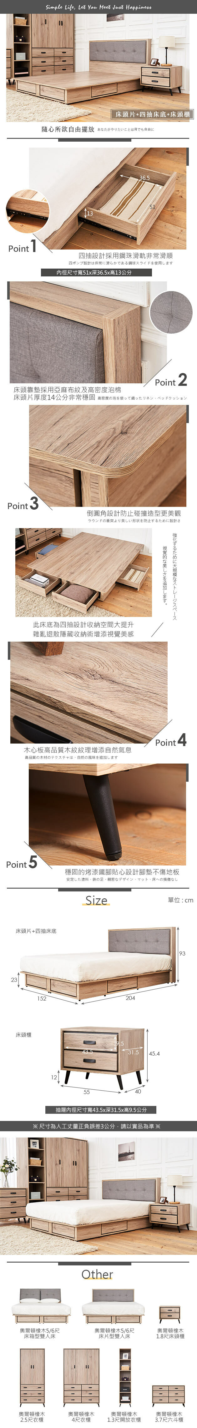名稱:奧爾頓橡木5尺床片型3件組-床片+床底+床頭櫃