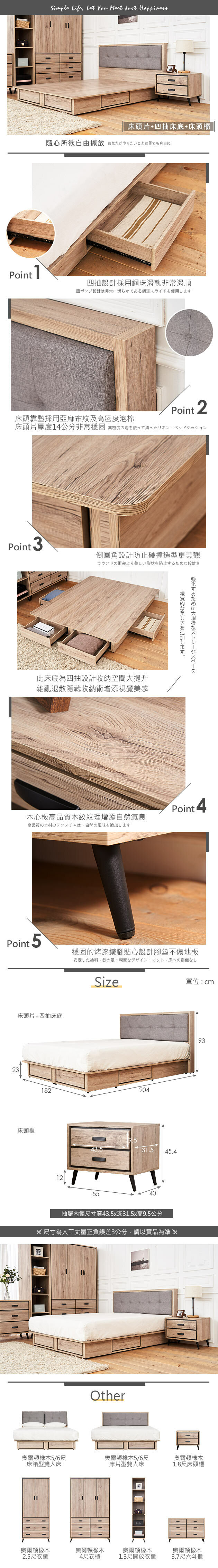 尺寸:床組-寬182x深204x高93公分、床頭櫃-寬55x深40x高45.4公分