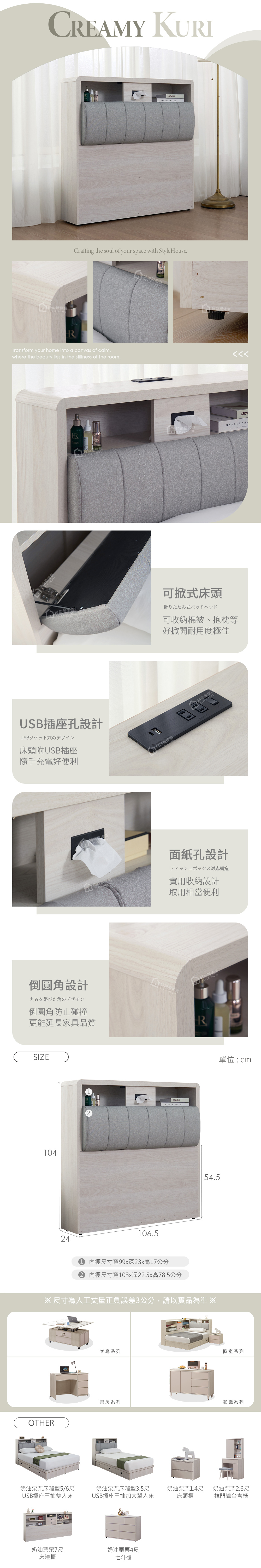 名稱:奶油栗栗3.5尺USB插座床頭箱