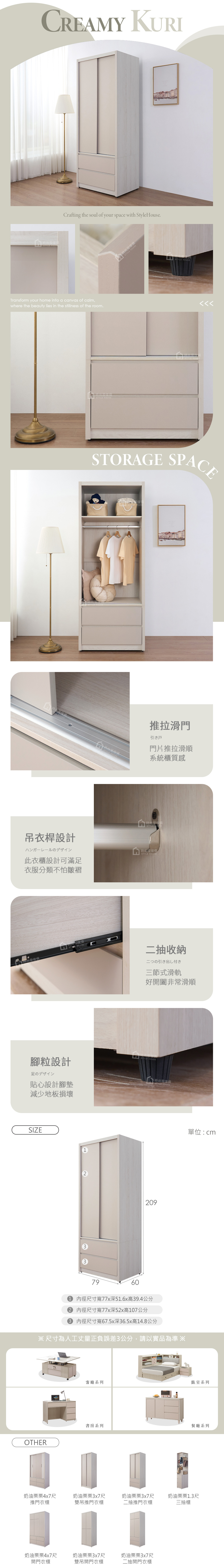 奶油栗栗3x7尺二抽推門衣櫃