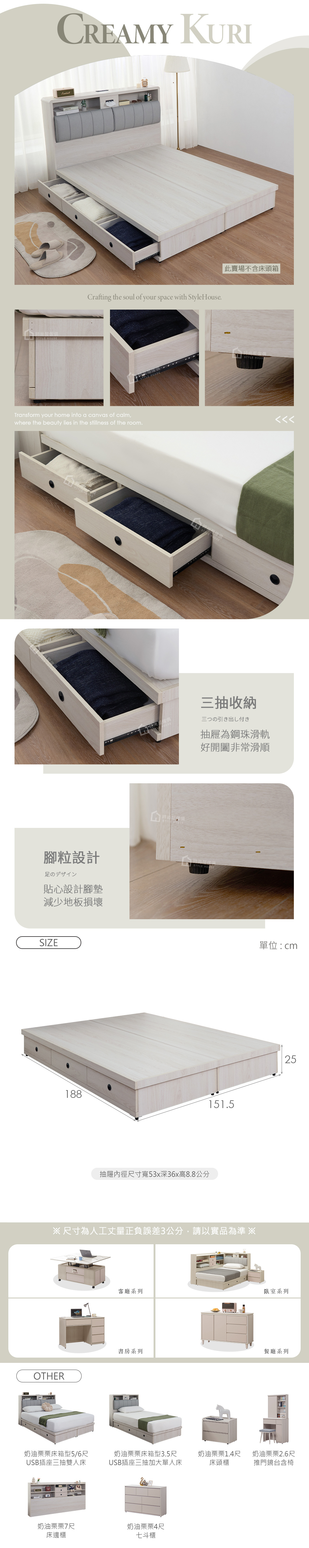 名稱:奶油栗栗5尺三抽雙人床底