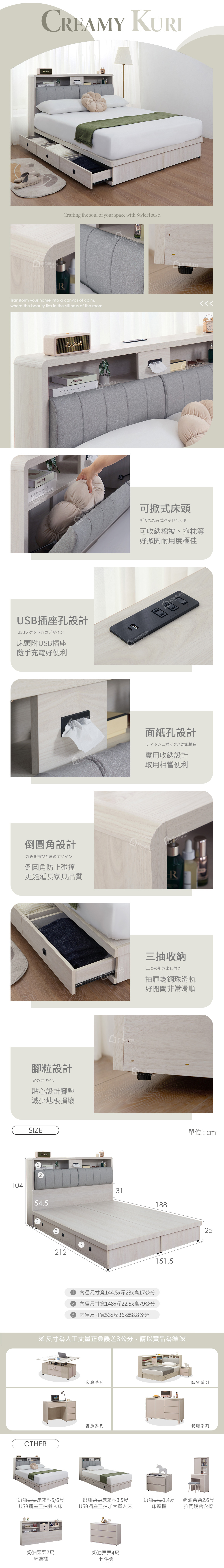 奶油栗栗床箱型5尺USB插座三抽雙人床