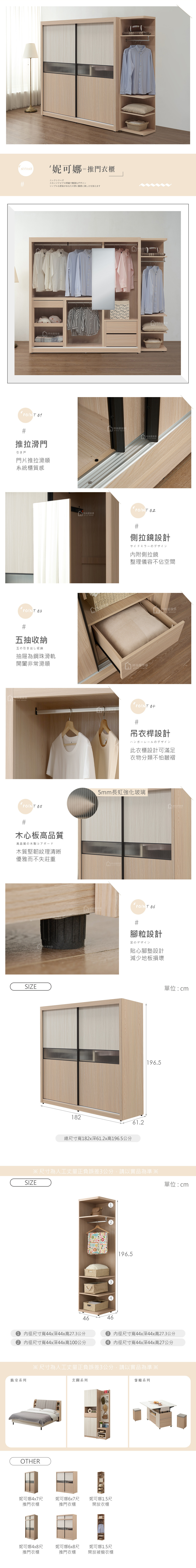 【時尚屋】[5U11]妮可娜7.6尺推門衣櫃,色系淺橡木色為主,點綴臥室視覺空間美感,材質上採用木心板、鋼珠滑軌等,均高於市場之產品規格,品質絕對有保證!此衣櫃在收納空間上採五抽,絕對可滿足您對收納的需求,相當於收納櫃之功能!有了他絕對可以讓您煥然一新!時尚屋帶給您對家具時尚新品味。