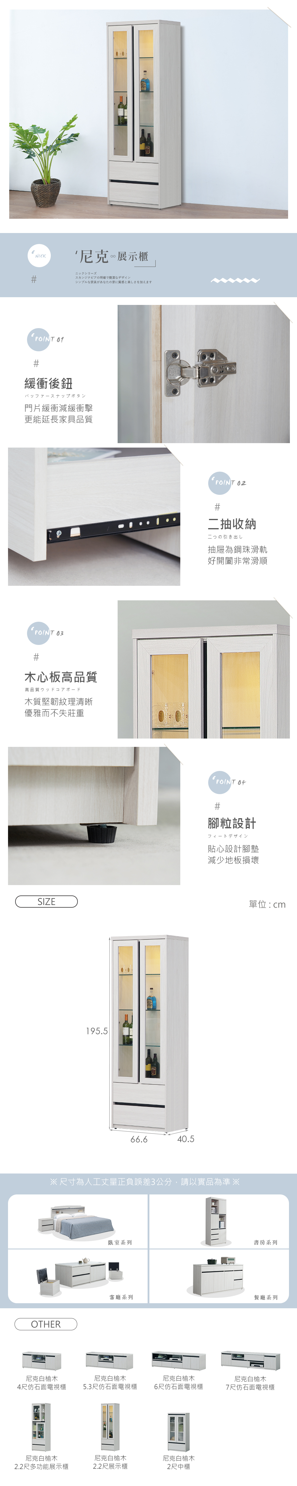 【時尚屋】[DV10]尼克白榆木2.2尺展示櫃,色系白榆木色為主,點綴客廳視覺空間美感,材質上採用木心板、鋼珠滑軌、緩衝後鈕等,均高於市場之產品規格,品質絕對有保證!此展示櫃在收納空間上採二抽+雙開門,絕對可滿足您對收納的需求,相當於收納櫃之功能!有了他絕對可以讓您煥然一新!時尚屋帶給您對家具時尚新品味。