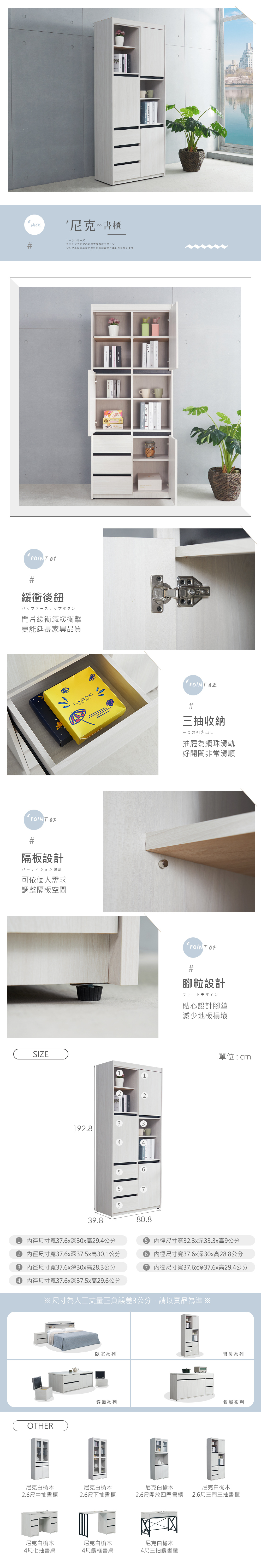 【時尚屋】[DV10]尼克白榆木2.6尺三門三抽書櫃,色系白榆木色為主,點綴書房視覺空間美感,材質上採用木心板、鋼珠滑軌、緩衝後鈕等,均高於市場之產品規格,品質絕對有保證!此書櫃在收納空間上採三抽,絕對可滿足您對收納的需求,相當於收納櫃之功能!有了他絕對可以讓您煥然一新!時尚屋帶給您對家具時尚新品味。