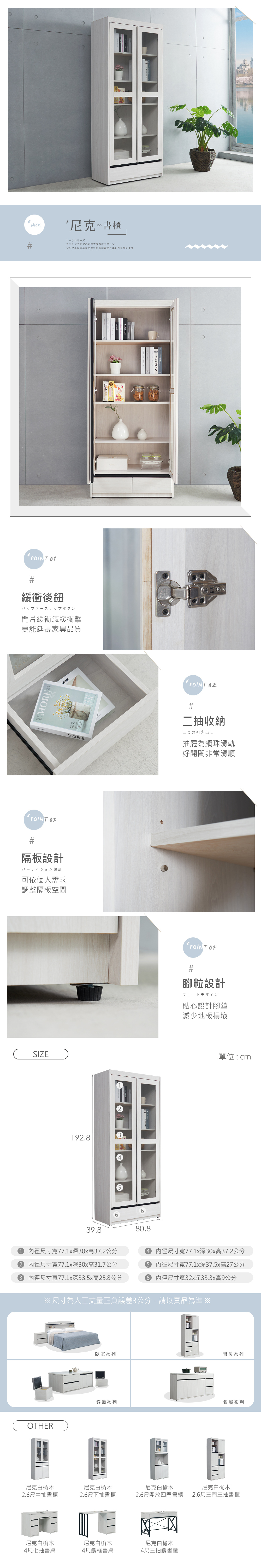 【時尚屋】[DV10]尼克白榆木2.6尺下抽書櫃,色系白榆木色為主,點綴書房視覺空間美感,材質上採用木心板、鋼珠滑軌、緩衝後鈕等,均高於市場之產品規格,品質絕對有保證!此書櫃在收納空間上採二抽,絕對可滿足您對收納的需求,相當於收納櫃之功能!有了他絕對可以讓您煥然一新!時尚屋帶給您對家具時尚新品味。