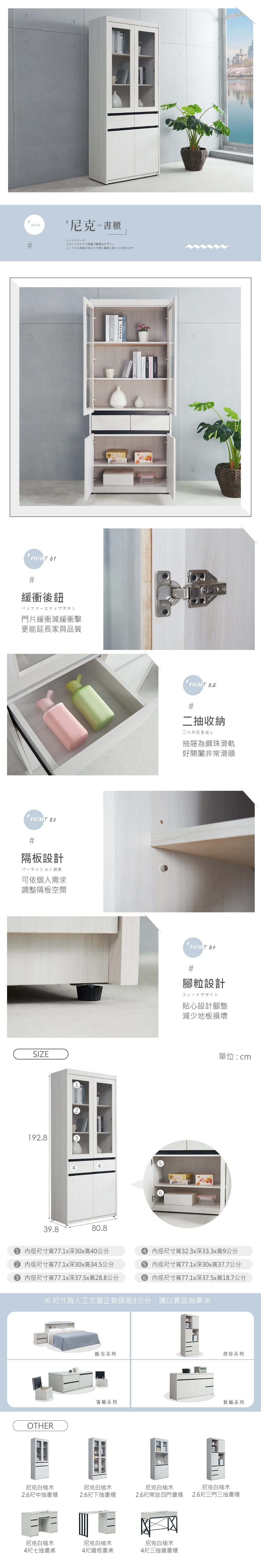 【時尚屋】[DV10]尼克白榆木2.6尺中抽書櫃,色系白榆木色為主,點綴書房視覺空間美感,材質上採用木心板、鋼珠滑軌、緩衝後鈕等,均高於市場之產品規格,品質絕對有保證!此書櫃在收納空間上採二抽,絕對可滿足您對收納的需求,相當於收納櫃之功能!有了他絕對可以讓您煥然一新!時尚屋帶給您對家具時尚新品味。