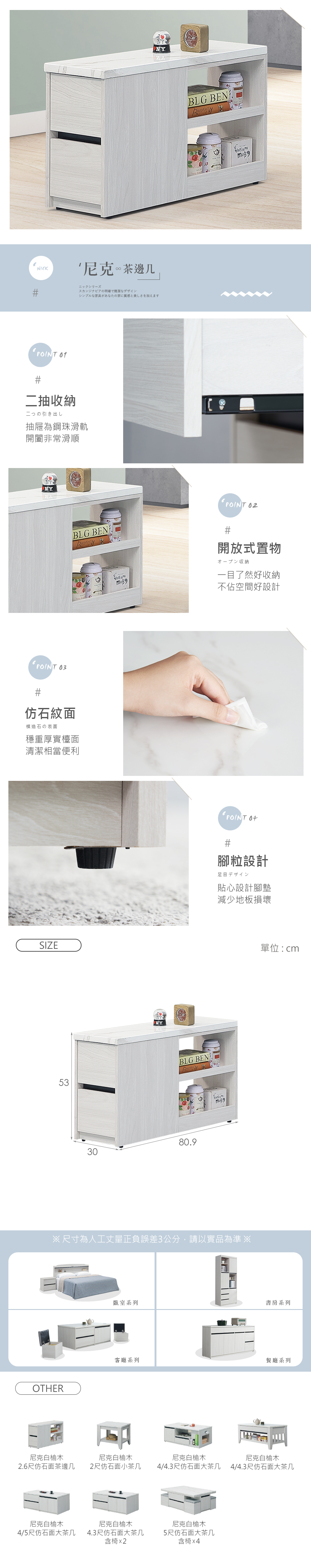 【時尚屋】[DV10]尼克白榆木2.6尺仿石面茶邊几,色系白榆木色為主,點綴客廳視覺空間美感,材質上採用木心板、仿石紋面、鋼珠滑軌等,均高於市場之產品規格,品質絕對有保證!此茶邊几在收納空間上採二抽,絕對可滿足您對收納的需求,相當於收納櫃之功能!有了他絕對可以讓您煥然一新!時尚屋帶給您對家具時尚新品味。