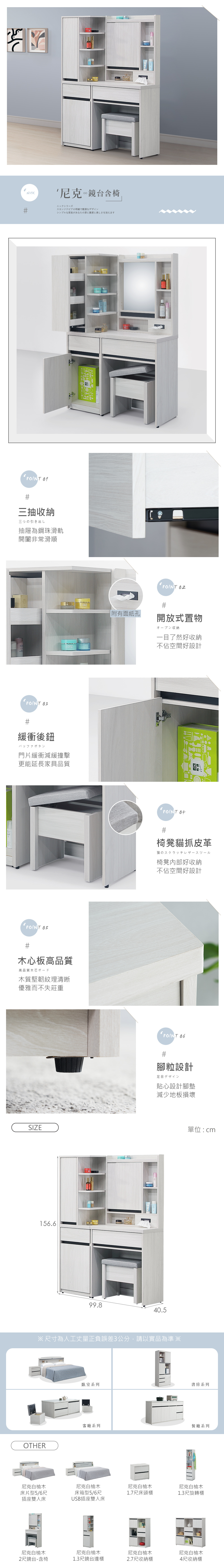 名稱:尼克白榆木3.3尺鏡台邊櫃組含椅