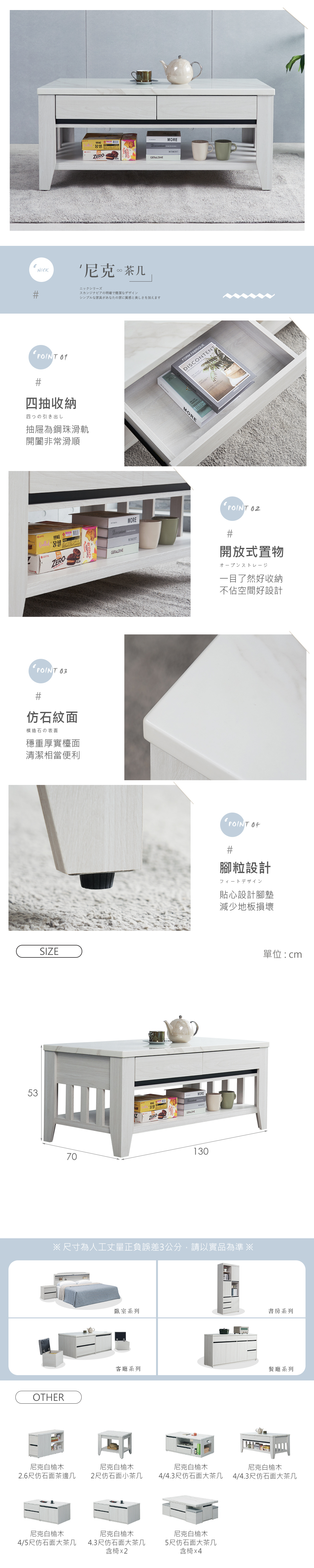 【時尚屋】[DV10]尼克白榆木4.3尺仿石面大茶几,色系白榆木色為主,點綴客廳視覺空間美感,材質上採用木心板、鋼珠滑軌、仿石紋面等,均高於市場之產品規格,品質絕對有保證!此茶几在收納空間上採四抽,絕對可滿足您對收納的需求,相當於收納櫃之功能!有了他絕對可以讓您煥然一新!時尚屋帶給您對家具時尚新品味。