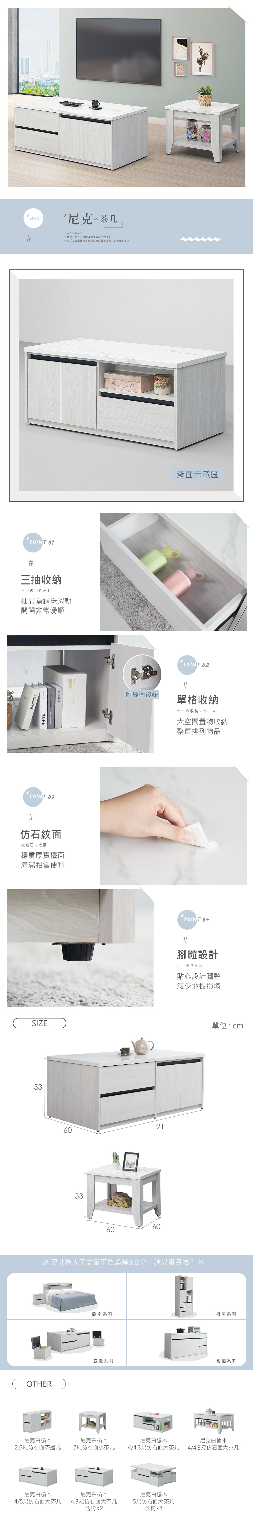 【時尚屋】[DV10]尼克白榆木4尺仿石面大小茶几,色系白榆木色為主,點綴客廳視覺空間美感,材質上採用木心板、仿石紋面、鋼珠滑軌、緩衝後鈕等,均高於市場之產品規格,品質絕對有保證!此茶几在收納空間上採三抽,絕對可滿足您對收納的需求,相當於收納櫃之功能!有了他絕對可以讓您煥然一新!時尚屋帶給您對家具時尚新品味。