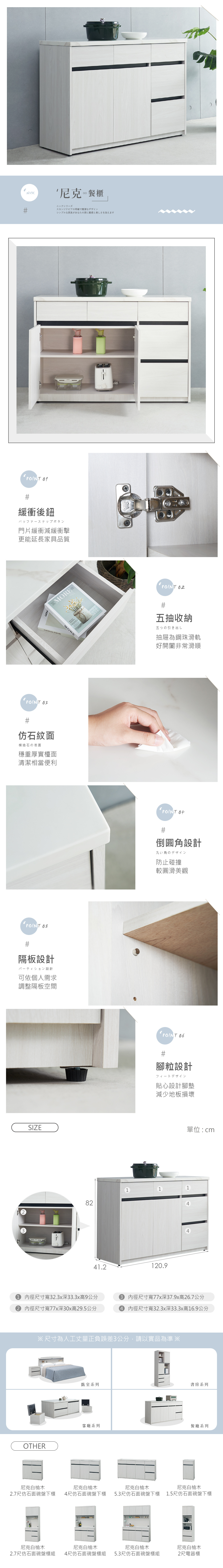名稱:尼克白榆木4尺仿石面碗盤下櫃