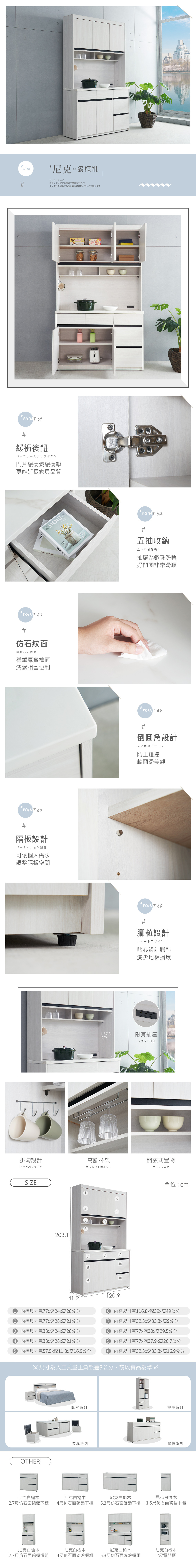 【時尚屋】[DV10]尼克白榆木4尺仿石面碗盤櫃組,色系白榆木色為主,點綴廚房視覺空間美感,材質上採用木心板、鋼珠滑軌、緩衝後鈕、仿石紋面等,均高於市場之產品規格,品質絕對有保證!此餐櫃在收納空間上採五抽,絕對可滿足您對收納的需求,相當於收納櫃之功能!有了他絕對可以讓您煥然一新!時尚屋帶給您對家具時尚新品味。