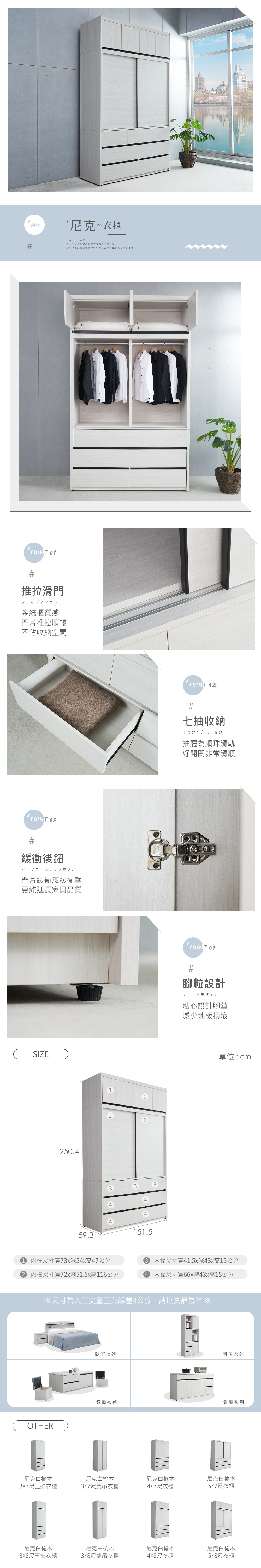 【時尚屋】[DV10]尼克白榆木5x8尺衣櫃,色系白榆木色為主,點綴臥室視覺空間美感,材質上採用木心板、鋼珠滑軌、緩衝後鈕等,均高於市場之產品規格,品質絕對有保證!此衣櫃在收納空間上採七抽+雙開門,絕對可滿足您對收納的需求,相當於收納櫃之功能!有了他絕對可以讓您煥然一新!時尚屋帶給您對家具時尚新品味。
