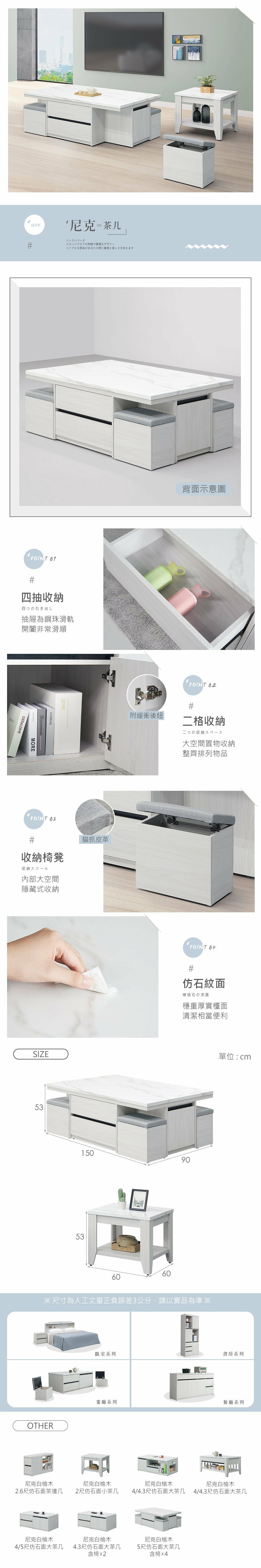 【時尚屋】[DV10]尼克白榆木5尺仿石面大小茶几,色系白榆木色為主,點綴客廳視覺空間美感,材質上採用木心板、仿石紋面、鋼珠滑軌、緩衝後鈕等,均高於市場之產品規格,品質絕對有保證!此茶几在收納空間上採四抽,絕對可滿足您對收納的需求,相當於收納櫃之功能!有了他絕對可以讓您煥然一新!時尚屋帶給您對家具時尚新品味。