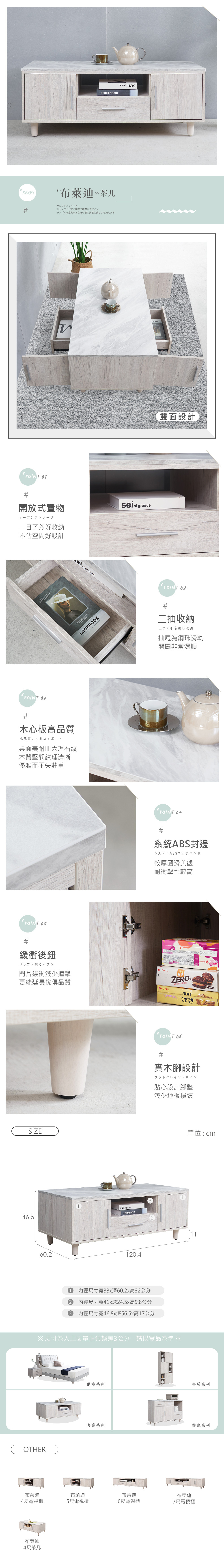 【時尚屋】[MX20]布萊迪4尺茶几,色系白橡色為主,點綴客廳視覺空間美感,材質上採用木心板、緩衝後鈕、鋼珠滑軌、實木腳、ABS封邊等,均高於市場之產品規格,品質絕對有保證!此茶几在收納空間上採二抽+單開門,絕對可滿足您對收納的需求,相當於收納櫃之功能!有了他絕對可以讓您煥然一新!時尚屋帶給您對家具時尚新品味。